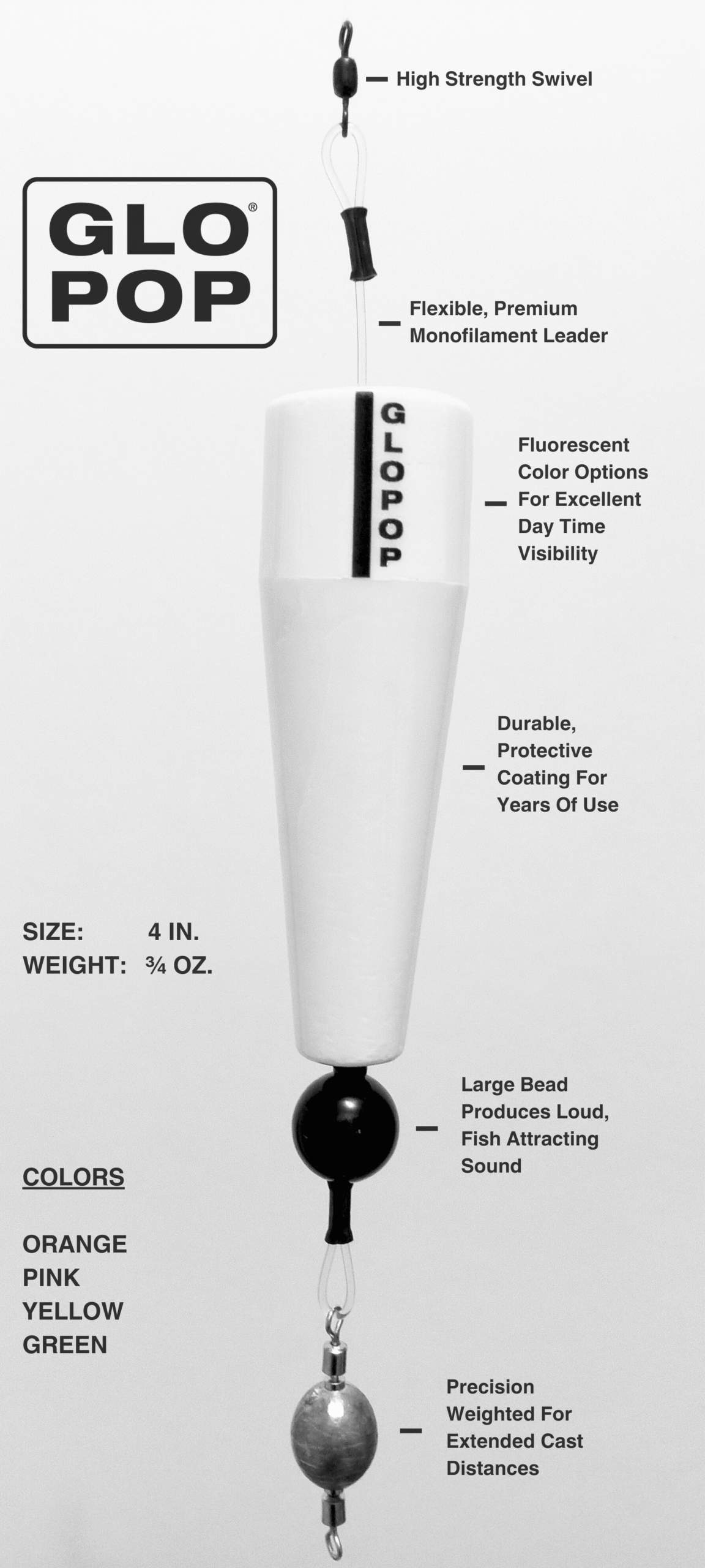 Designed for anglers seeking the same GloPop® quality in a day time popping cork, our standard popping cork delivers outstanding performance, durability and value.